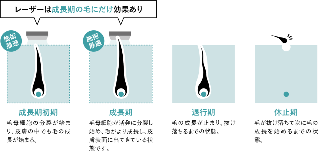 「成長期」「退行期」「休止期」がある中で脱毛効果のある成長期の毛は全体の2割しかなく残りの8割は退行期か休止期にあたります。