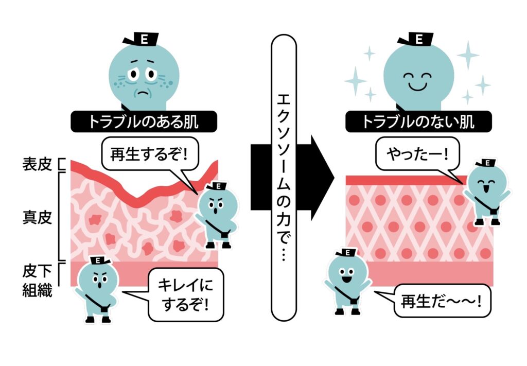 近年の研究データでは、エクソソームは細胞から細胞へと情報を伝達するメッセンジャーのような役割を担うことが分かり、「活性化しなさい」と細胞同士で良い情報を伝達し、損傷部分の細胞や臓器の修復、再生を促がします。細胞活性化の他、高い皮膚再生、血管再生、抗炎症作用などが確認されています。