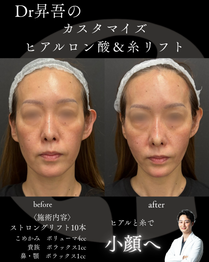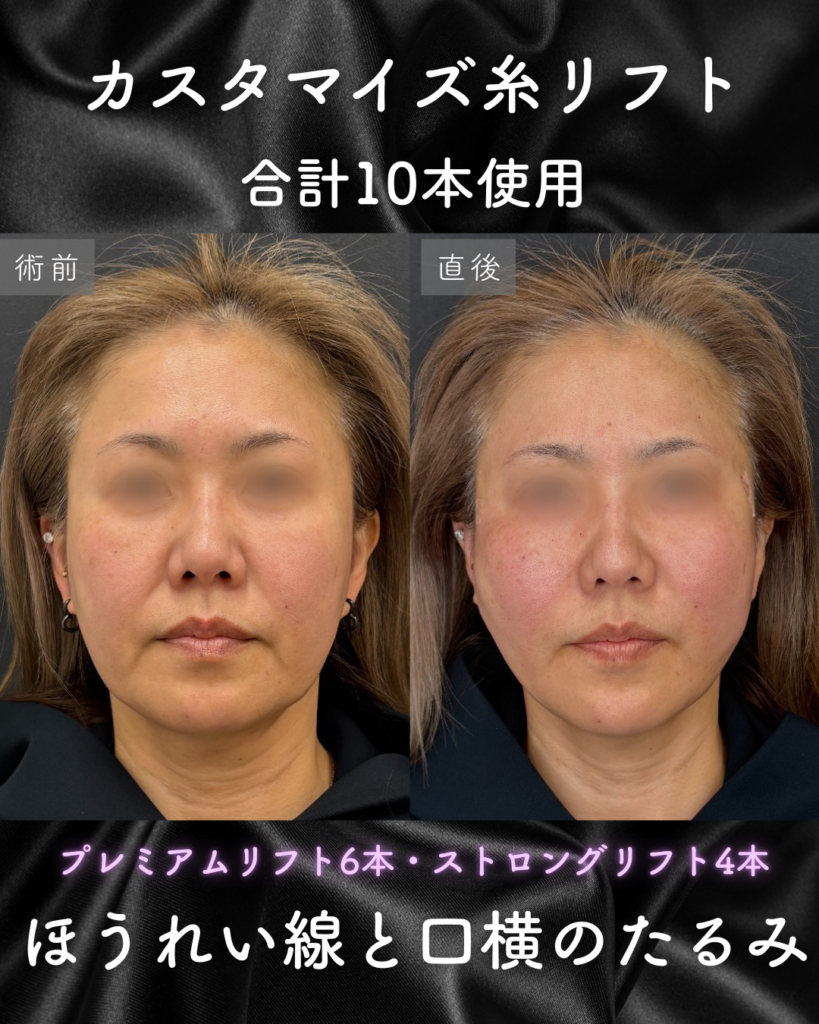 40代になると、頬の下垂やフェイスラインのぼやけが進みやすくなります。 片側4〜6本程度を目安に、引き上げ方向やデザインを細かく設計するケースが増えます。