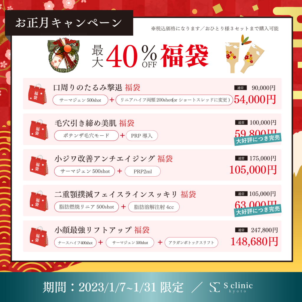 キャンペーン【最大40%off福袋】が追加されました。 2023 1/07 お知らせ キャンペーン キャンペーン【最大40%off福袋】が追加されました。 既に「毛穴引き締め美肌 福袋」と「二重顎撲滅フェイスラインスッキリ 福袋」が大好評につき完売致しました! キャンペーンは2023年1月31日までになります!お早めに! お知らせ キャンペーン