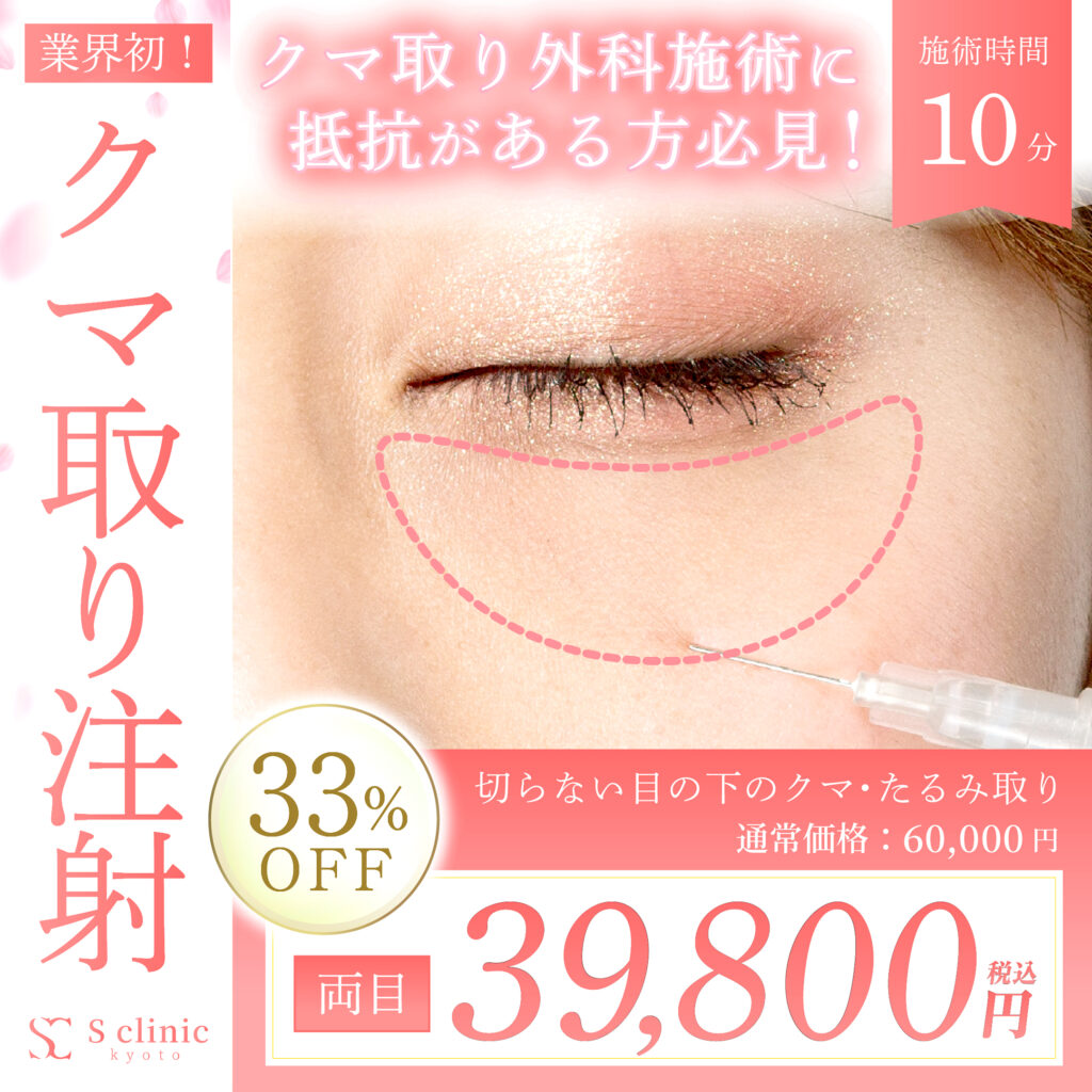 キャンペーン【切らないクマ取り注射】が追加されました。 2023 12/01 キャンペーン キャンペーン【切らないクマ取り注射】が追加されました。 クマ取りの外科施術に抵抗のある方は必見の内容となっています。33%OFFで両目施術いただけます! キャンペーン